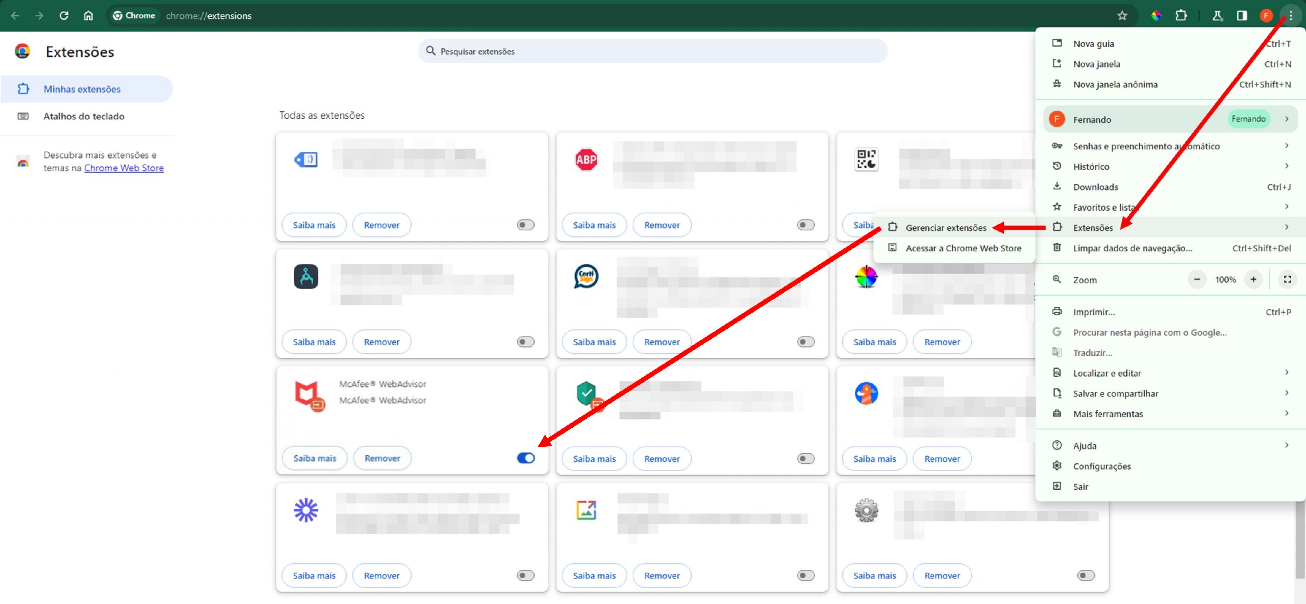 Pode ser solicitado, pelo Suporte, que desative plugins ou Extensões do Chrome.