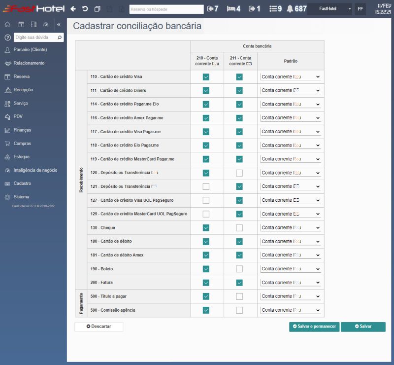 2- Veja abaixo como fazer essa configuração é fácil e intuitivo. Para cada tipo de título da coluna à esquerda, indique para quais contas ele pode ser conciliado e, na última coluna à direita, indique qual a conta padrão para conciliação.