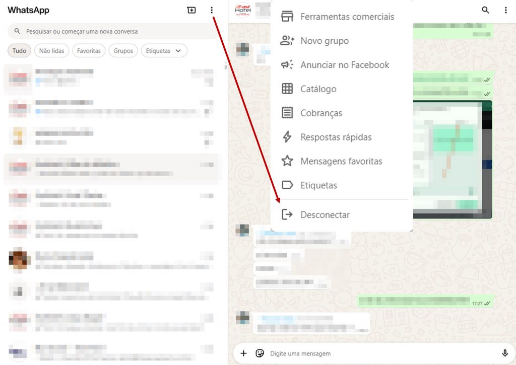 2- Acesse o Whatsapp Web, nesta mesma janela do Chrome, desconecte-se do Whatsapp Web (clicando nos “tres pontinhos” localizado na parte esquerda da tela, acima das conversas e, em seguida, em Desconectar).